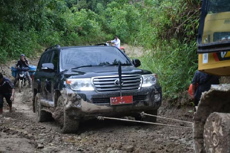 Mobil yang dikendarai Gubernur Sulbar Ali Baal Masdar Harus di Derek untuk melewati jalan yang Licin dan Mendaki