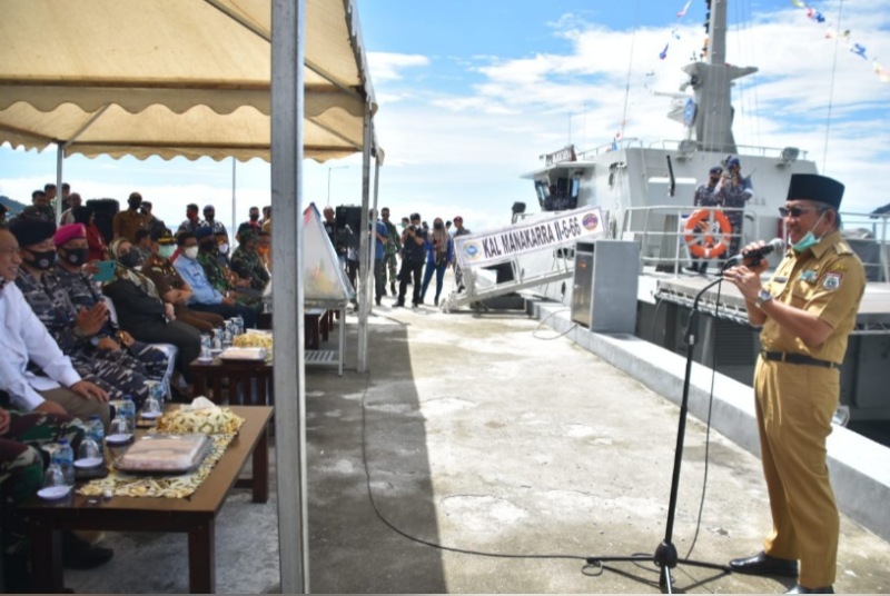 Gubernur Sulbar, Ali Baal Masdar, memberikan sambutan saat meresmikan nama Kapal TNI AL yang dilaksanakan di Dermaga Rangas Lanal Mamuju.
