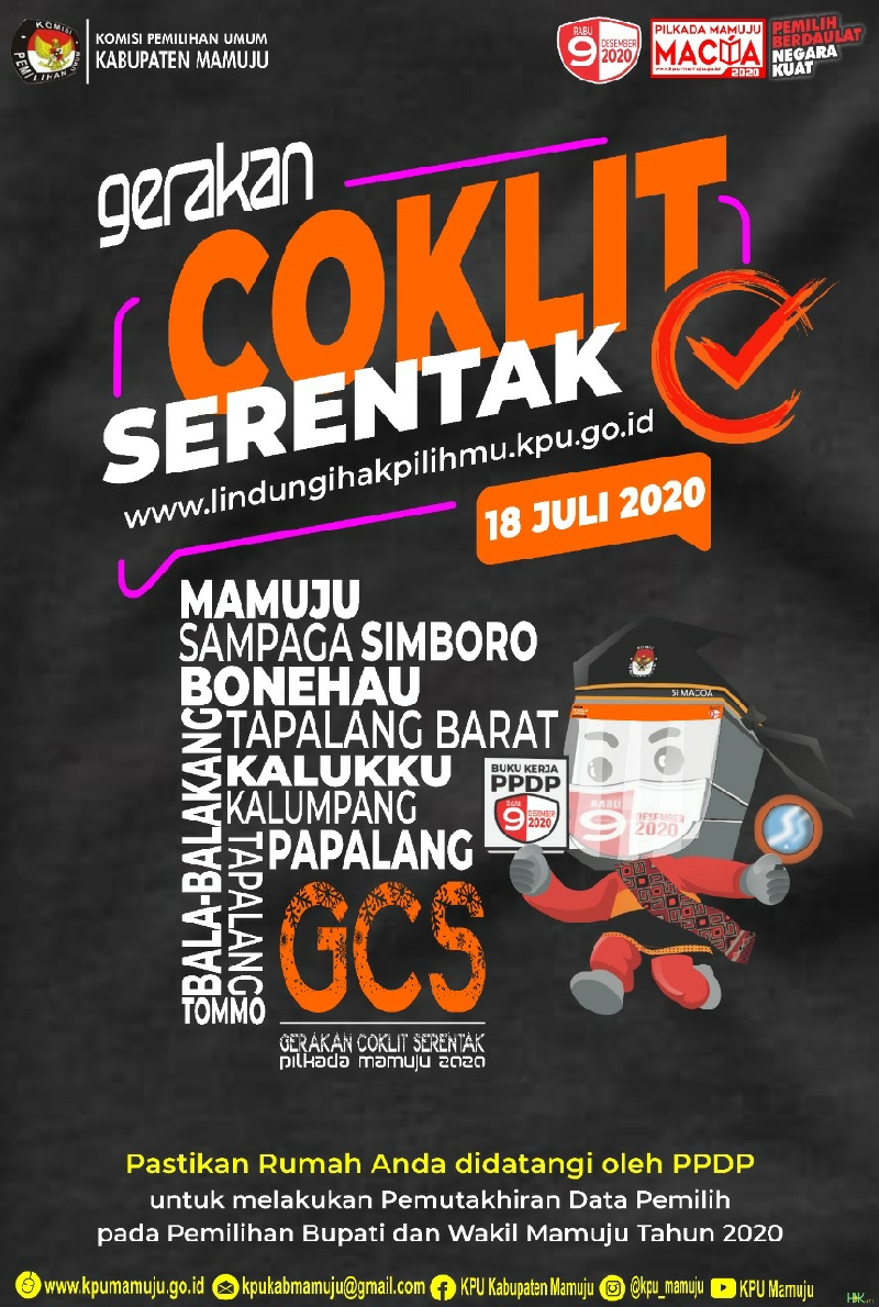 Jalurnusantara.com- Mamuju- Pencocokan dan penelitian (coklit) tahapan pemutakhiran dan penyusunan daftar pemilih Pilkada 2020 telah di mulai, ditandai dengan Gerakan Klik Serentak (GKS), pada hari Rabu, 15 Juli 2020, yang digelar di lima titik, yakni, Dua titik di kecamatan Mamuju, satu di Simboro, satu di Kalukku, serta satu lainnya di kecamatan Sampagadi Mamuju.