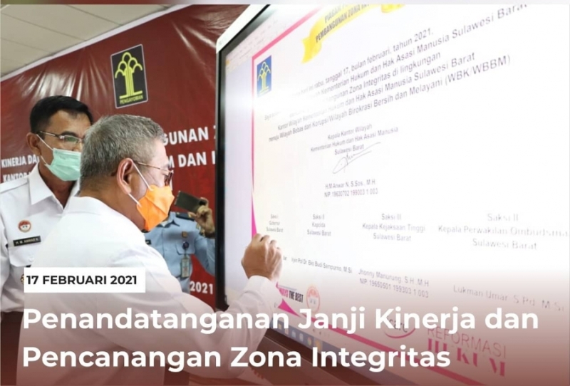 Berlangsung di Kanwil Kemenkumham Sulbar, pengucapan dan penandatanganan deklarasi janji kinerja dan pencanangan pembangunan zona integritas menuju WBK/WBBM lingkup Kemenkumham Sulbar, dipimpin langsung Kepala Kanwil Kemenkumham Sulbar, M. Anwar.